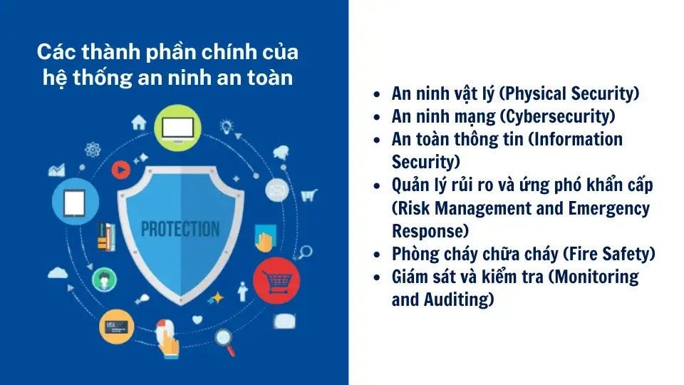 Hệ thống an ninh an toàn gồm nhiều thành phần chính, mỗi thành phần đóng vai trò quan trọng trong việc bảo vệ con người, tài sản, và thông tin. Dưới đây là các thành phần chính: