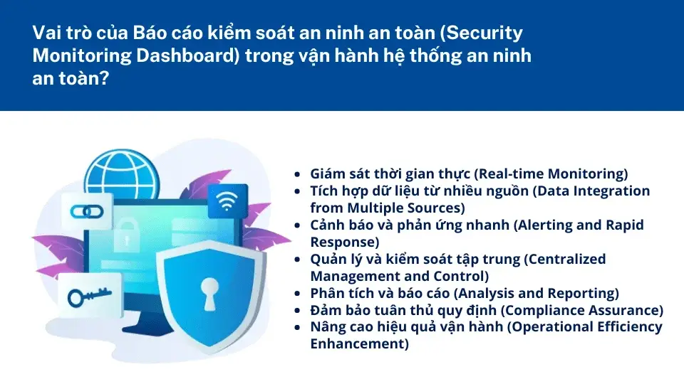 Hệ thống Báo cáo kiểm soát an ninh an toàn (Security Monitoring Dashboard) đóng vai trò quan trọng trong việc vận hành và quản lý hệ thống an ninh an toàn. Dưới đây là các vai trò chính của hệ thống này: