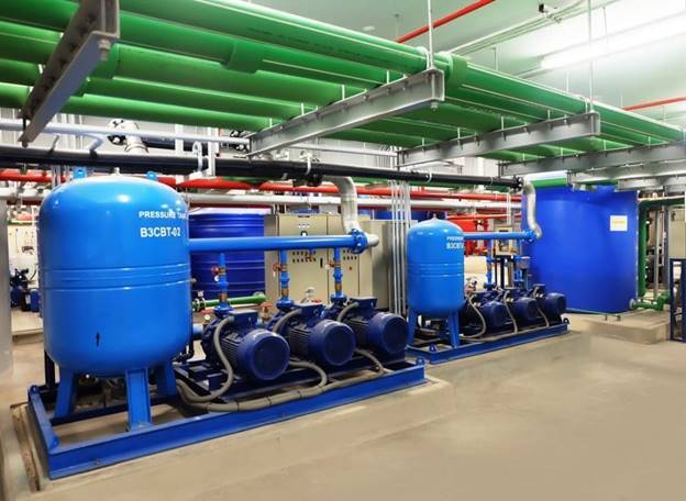 - Hệ thống cấp nước bơm: Nước được vận chuyển bằng máy bơm để tăng áp lực và lưu lượng nước.