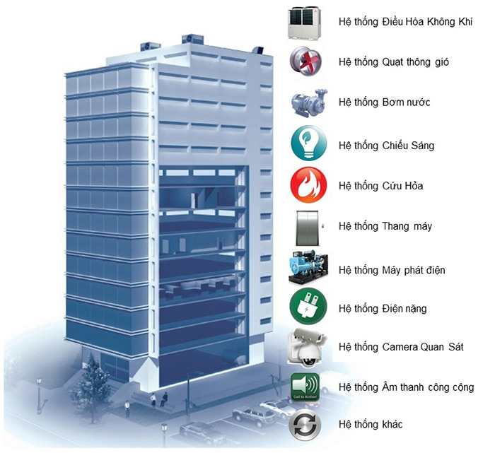 - Tích hợp với các hệ thống phần mềm và phần cứng của nhiều hệ thống con khác nhau như: báo cháy, an toàn, điều khiển truy nhập hay điều khiển chiếu sáng. Qua đó cải tiến hệ thống vận hành, nâng cao hiệu quả hoạt động quản lý tòa nhà.
