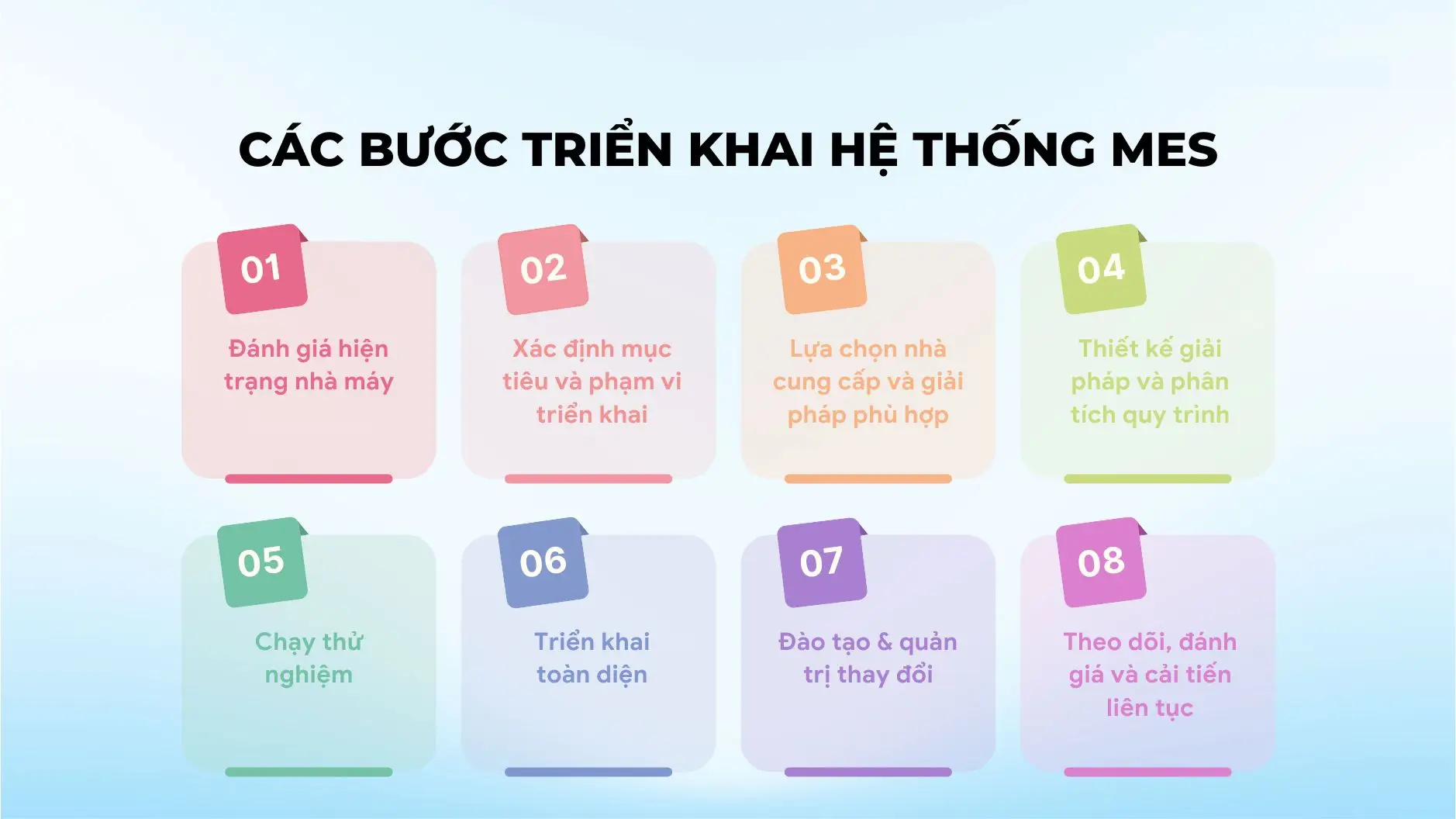- Thành lập ban triển khai MES liên phòng ban, có người quản lý dự án (PM) rõ ràng