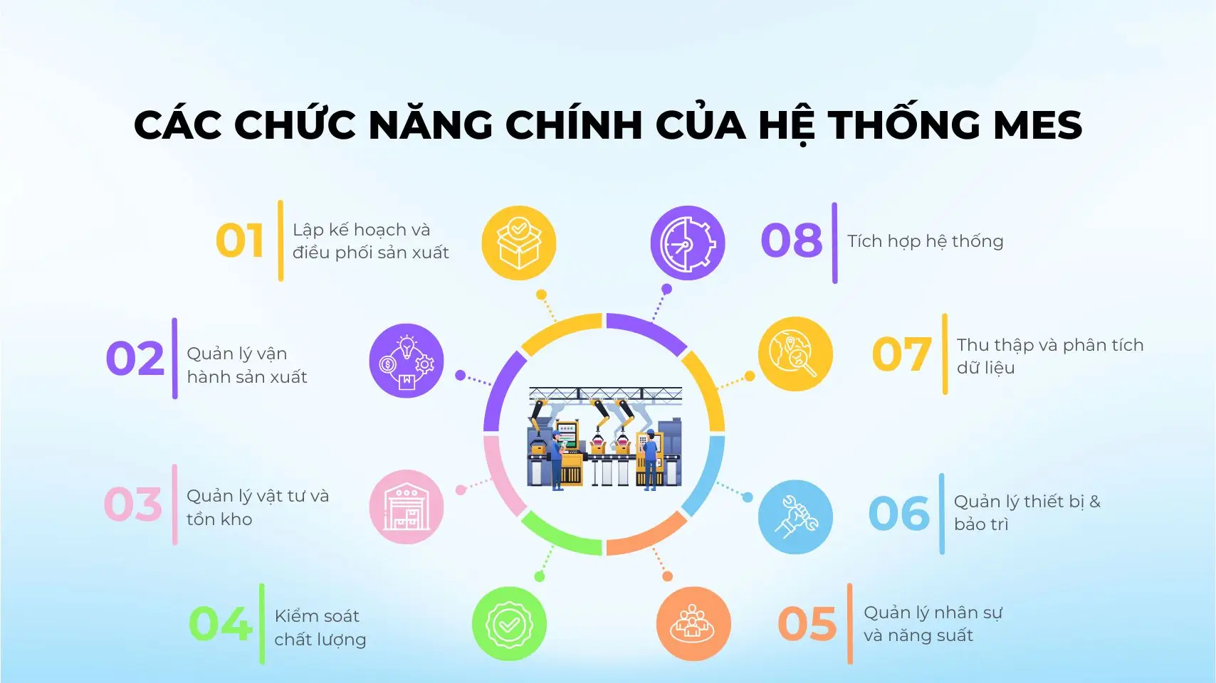 Hệ thống MES tích hợp nhiều chức năng cốt lõi nhằm kiểm soát toàn diện mọi khía cạnh của quá trình sản xuất – từ nguyên vật liệu đến sản phẩm hoàn thiện. Mỗi chức năng đều đóng vai trò quan trọng trong việc tối ưu vận hành, nâng cao năng suất và giảm thiểu sai sót. Cụ thể: