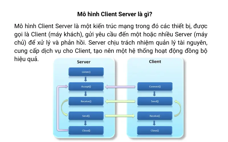 Mô hình Client Server là một kiến trúc mạng trong đó các thiết bị, được gọi là Client (máy khách), gửi yêu cầu đến một hoặc nhiều Server (máy chủ) để xử lý và phản hồi. Server chịu trách nhiệm quản lý tài nguyên, cung cấp dịch vụ cho Client, tạo nên một hệ thống hoạt động đồng bộ hiệu quả.