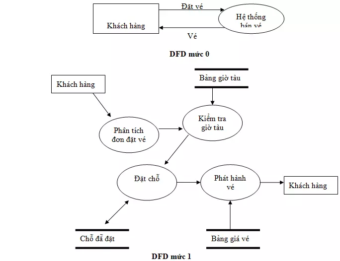 Biểu đồ luồng dữ liệu có thể được dùng để biểu diễn cho một hệ thống hay phần mềm ở bất kì mức nào, từ tổng quát cho đến chi tiết. Trong thực tế, DFD có thể được phân chia thành nhiều mức biểu diễn. Sau đây là minh họa một DFD cho hệ thống bán vé tầu.